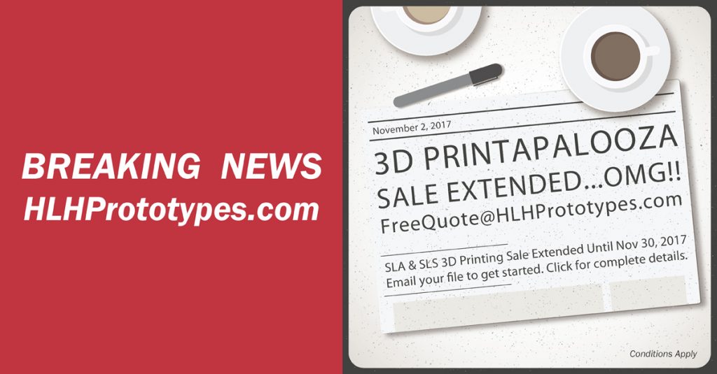 Prototypes3D Printapalooza at HLH is extended until November 30, 2017. Too many of our customers are enjoying this sale, so we just couldn't end it! Program...