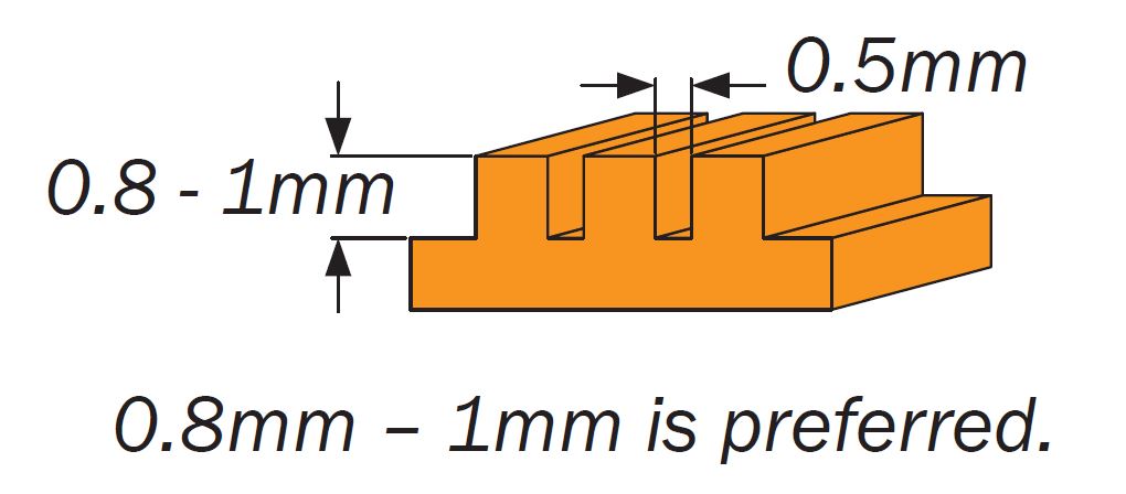 Walls – thicker walls are at risk of warpage. Thin walls can also be a problem area. 0.7mm minimum, but 1mm is preferred.